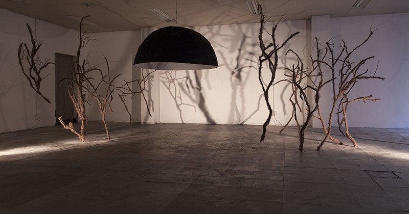 웅크린 바람의 그림자 (구전되어져 내려오는 자장가 사운드 있음)/Crouched shadow of the wind (this work includes orally handed down traditional lullaby)/1500mm diameter resin hemisphere,mohair thread, wire, plywood/dimensions variable/2015