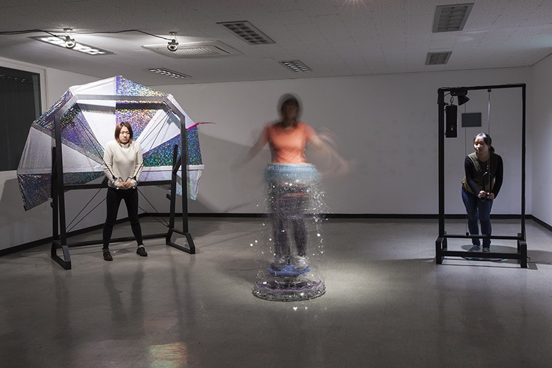 왼쪽부터 1. Cable Crossover/ iron, fabric, fake feather/160*40.5*200(cm) /2015 2. Twistrun/ Twistrun, beads/40*40*122(cm)/2015 3. Cable Pressdown/ iron. light/91*90*200(cm)/2015